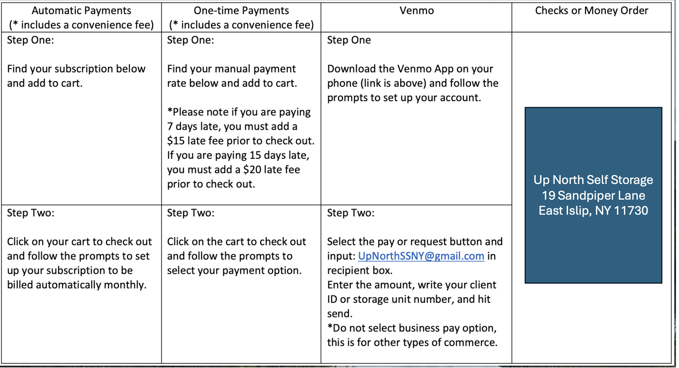 Quick and Easy Monthly PaymentsTO DOWNLOAD VENMO CLICK HERE Online Payments Online Payments Clear Filters Filter Clear Filter One Time Payment $915.00 10x10 One Time Payment 2024 $93.50 10x10 Automatic Payment Subscription 2024 $93.50 every month 10x20 One Time Payment 2024 $185.40 10x20 Automatic Payment Subscription 2024 $185.40 every month Late fee $20.00 No results found No results match your search. Try removing a few filters.